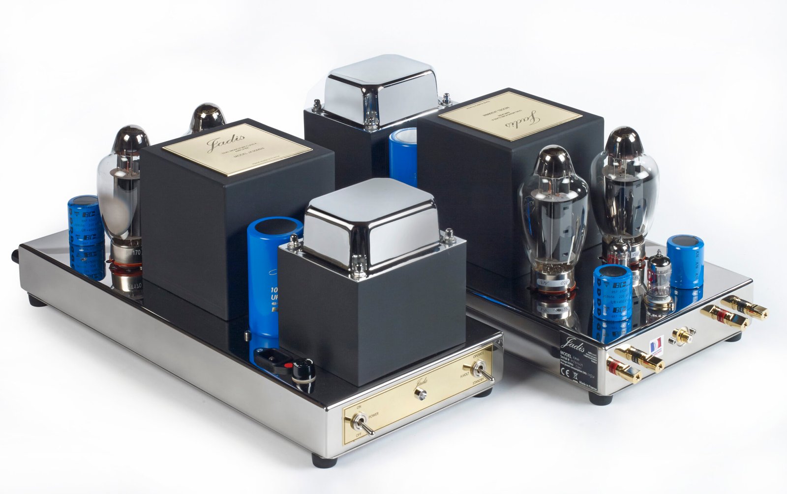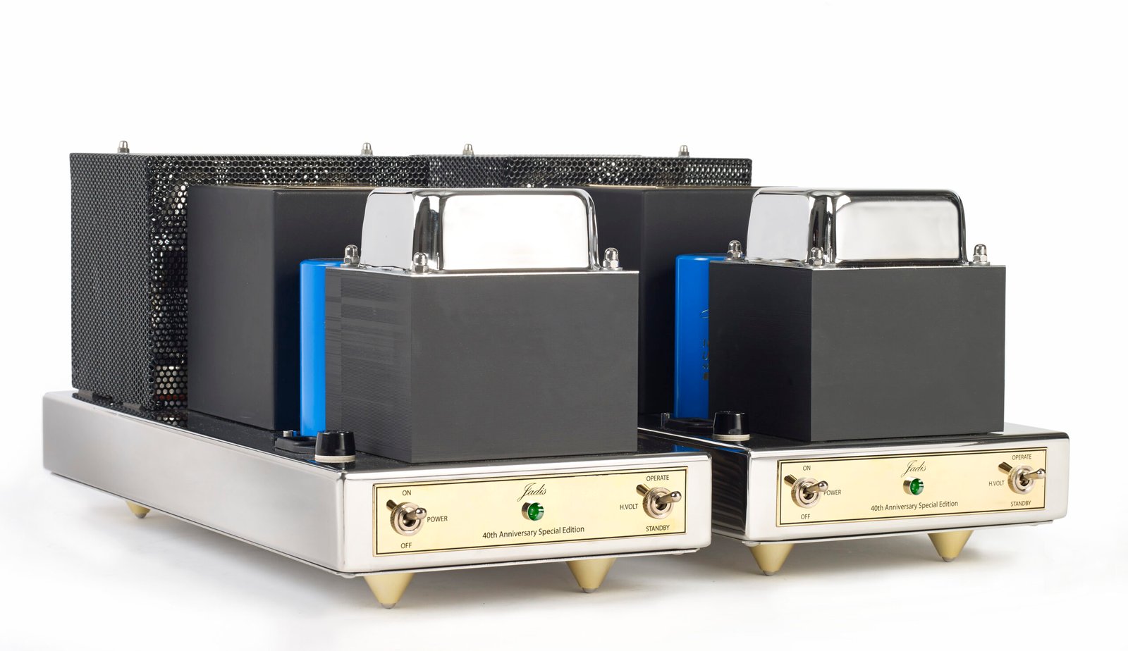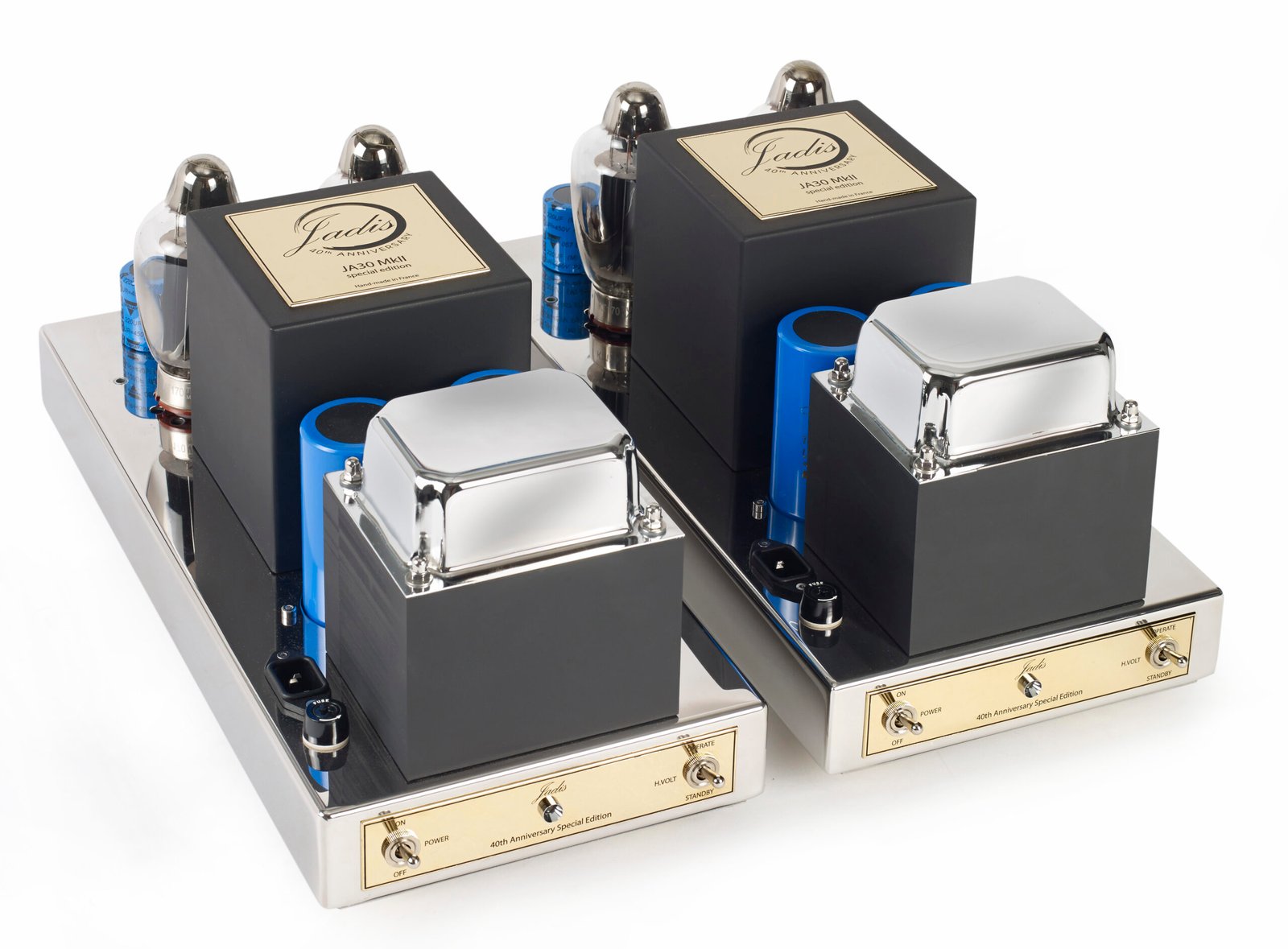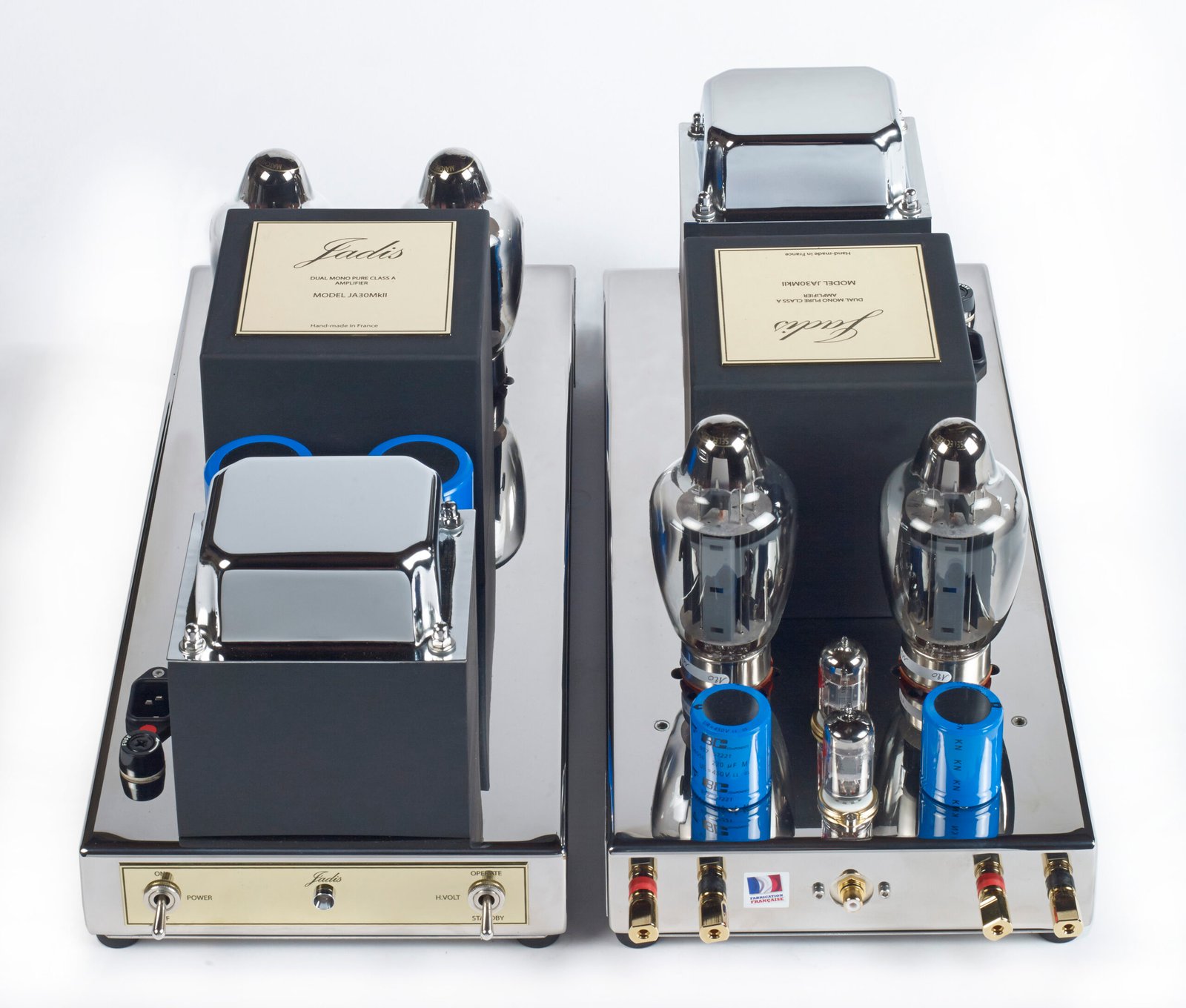 The JA30, a pure class A 45 watt per side amplifier, is a very effective monoblock. Each tube is protected by a fuse and is self-biasing even when tubes are replaced, no adjustments are necessary (but the tubes have to be paired). Output tubes can be either KT8,6CA7, KT120 or KT150S and the amps are designed to deliver full power at 15Hz, making for extraordinary bass.