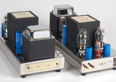 The SE300B supplies a power of 10W RMS and functions in pure class-A with single-ended mounting (the two tubes are in parallel) with an automatic bias. The two high voltages, driver and power, have vacuum-tube power supplies. The bandwidth (at –3dB) is from 20Hz to 20kHz, without any feedback. The driver stage, powered at 400V, is built around a double-triode 6SN7. The two elements of the tube are mounted in cascade. The output stage is powered at 320V, which allows the tubes to work in the best conditions.